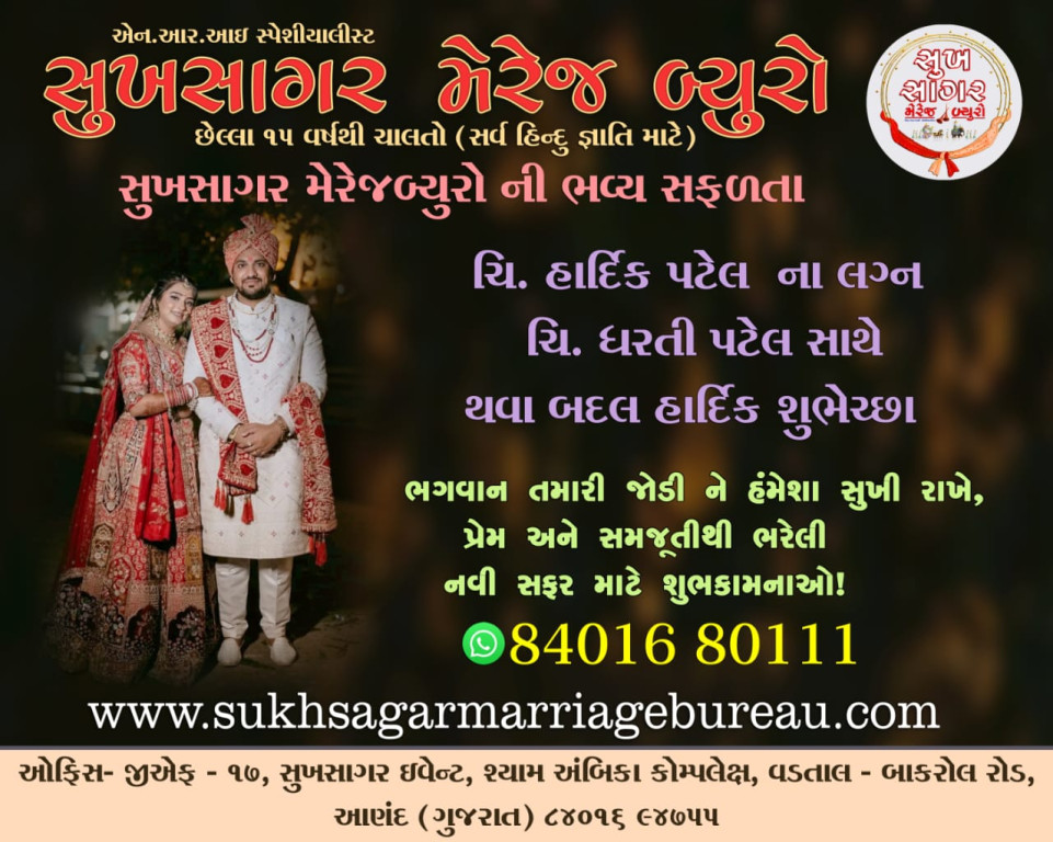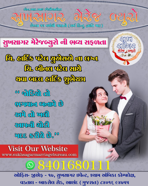 Sukh Sagar Marriage Bureau is the best marriage bureau. I have found the person I like in Sukh Sagar Marriage Bureau, so we are thankful to Sukh Sagar Marriage Bureau.